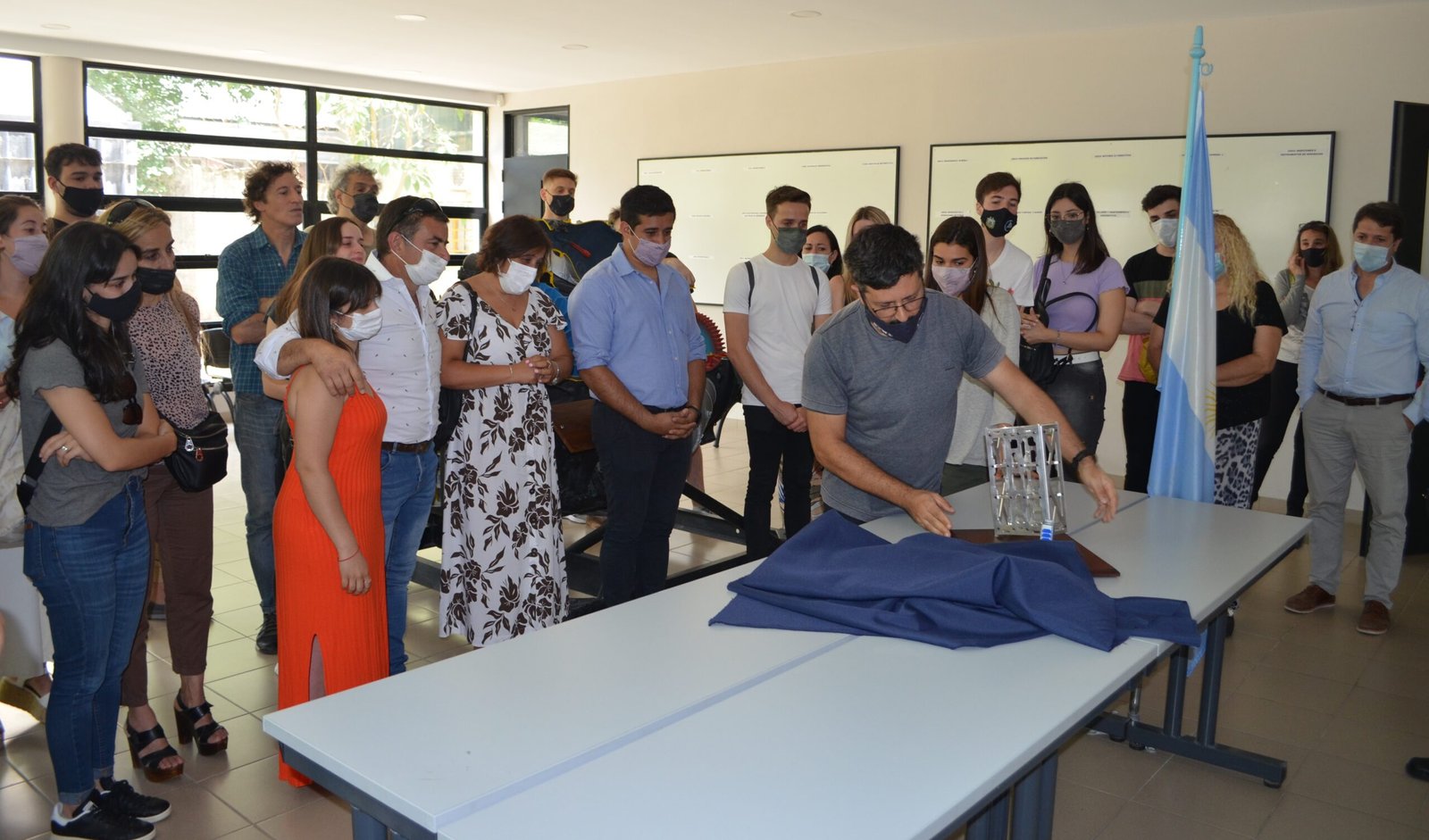 En la placa puede leerse: “En homenaje a Matías N. Barceló, Ingeniero Aeronáutico. Tus amigos, compañeros y profesores te recordamos por habernos marcado con tu amistad, disfrutando cada momento compartido en tu paso por la Facultad. Siempre estarás entre nosotros”.