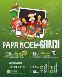 El viernes 17 el Grinch estará en la peatonal de Los Polvorines y Papá Noel en la de Grand Bourg. Y el sábado 18 Papá Noel vuelve a la peatonal de Los Polvorines y el Grinch a la de Grand Bourg.