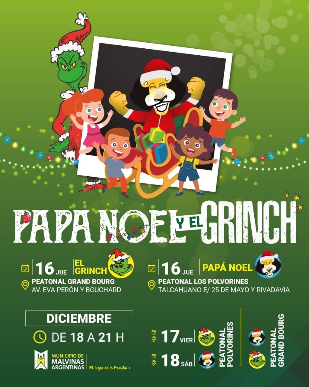 Habrá un gran festival familiar el domingo 19 en las inmediaciones del Palacio Municipal. Y el 16, 17 y 18 Papá Noel y el Grinch estarán recorriendo el distrito. Todo de manera libre y gratuita.