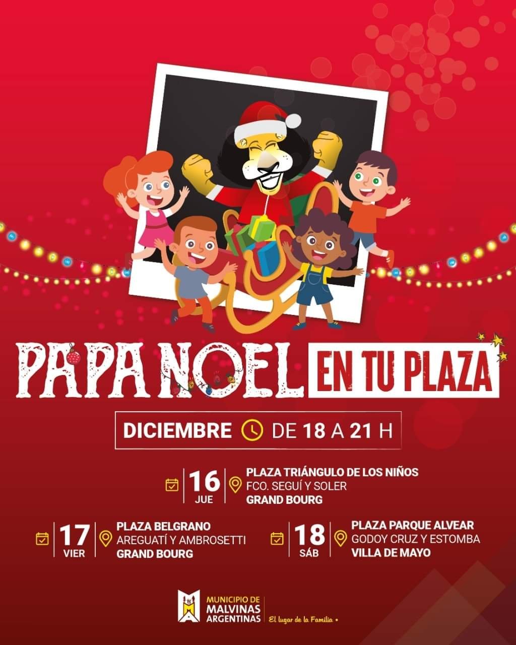 Además, Papá Noel recorrerá las plazas de 18 a 21 h. El jueves 16 estará en la plaza Triángulo de Los Niños (Francisco Seguí y Soler, Grand Bourg). El jueves 17 en la plaza ARA Gral. Belgrano (Areguati y Ambrosetti, Grand Bourg). Y el sábado 18 en la plaza Parque Alvear (Godoy Cruz y Estomba, Villa de Mayo).