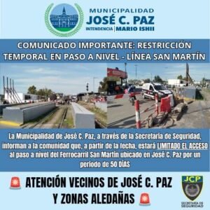 La Municipalidad de José C. Paz, a través de la Secretaría de Seguridad, informan a la comunidad que, a partir de la fecha, estará *LIMITADO EL ACCESO* al paso a nivel del Ferrocarril San Martín ubicado en José C. Paz por un período de 50 DÍAS.