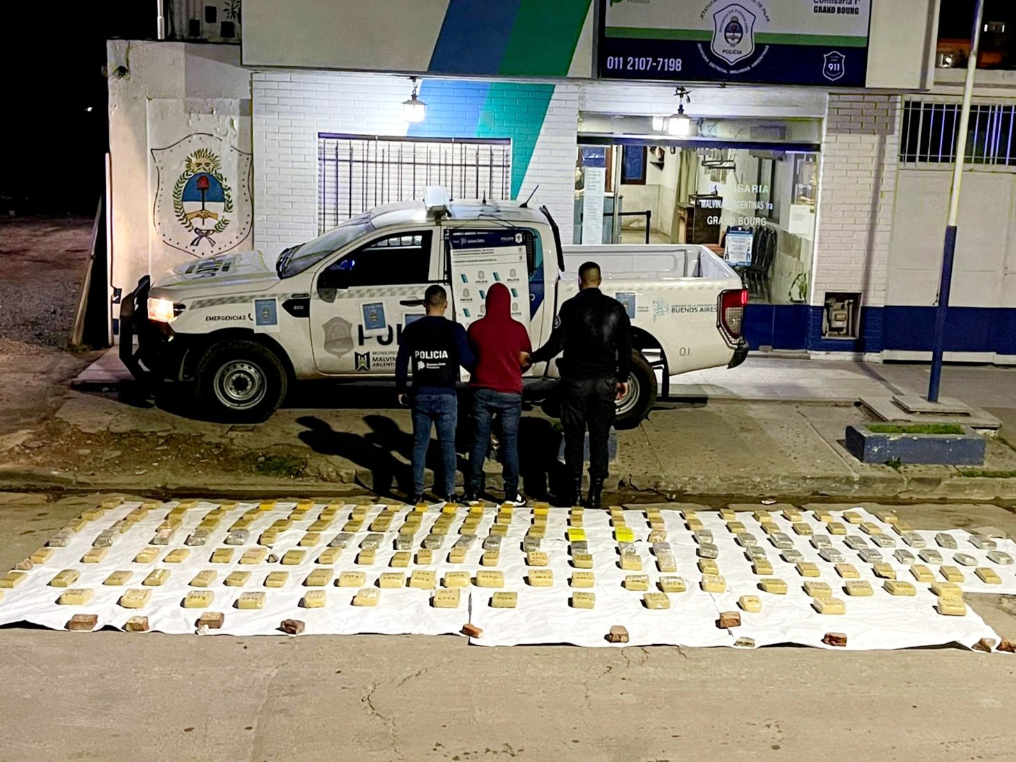 Al tomar la calle Viena en su intersección con Oliden en la ciudad de Grand Bourg, fue arrinconado por las patrullas que acudieron tras el aviso. En presencia de dos testigos de la zona, se revisó un bolso ubicado en el asiento trasero y se encontraron panes de marihuana fraccionados. Al abrir el baúl la sorpresa fue mayor ya que se encontraron decenas de ladrillos de similares características.